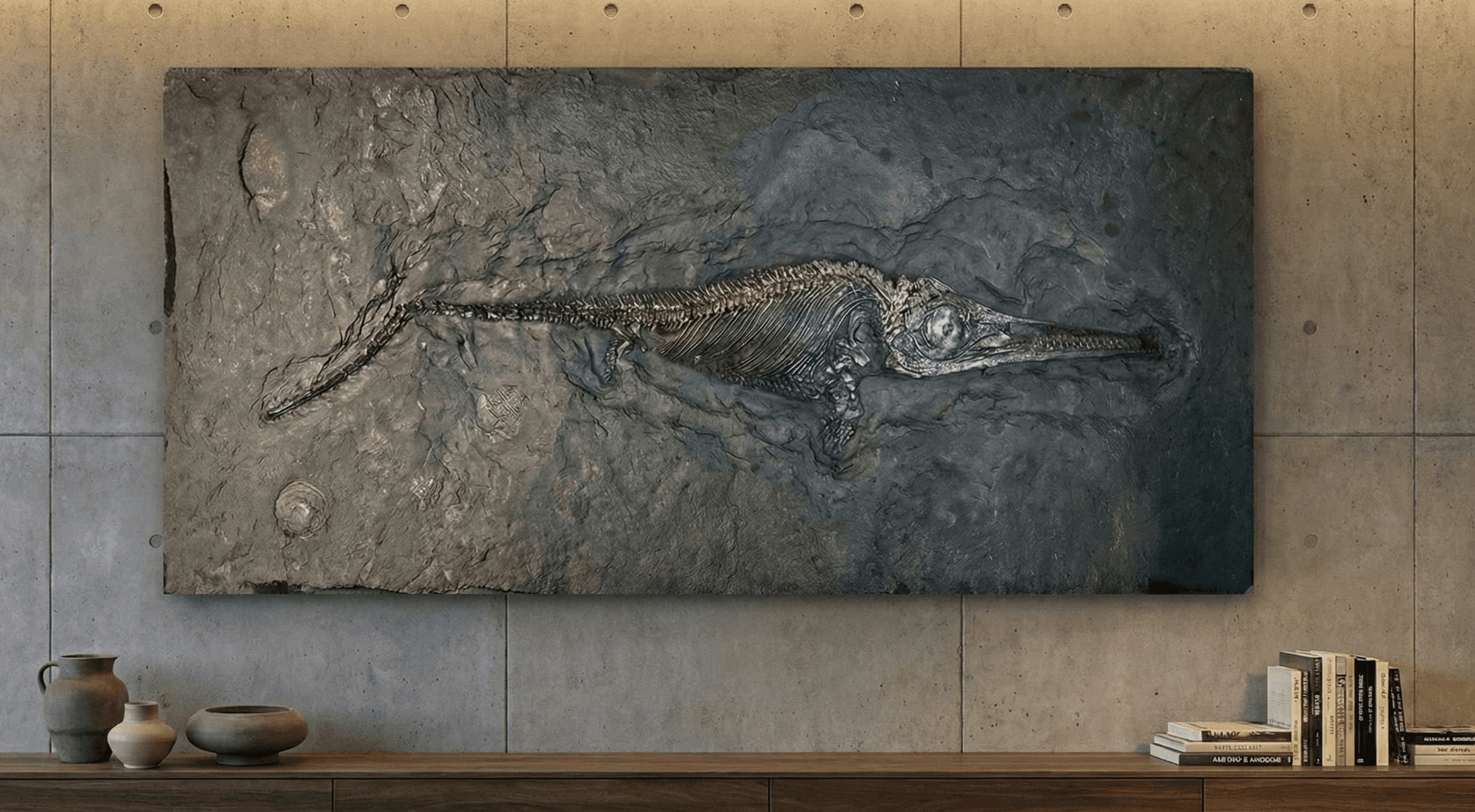 Aesthetic Application The deep, charcoal-toned stone provides a dramatic contrast to the intricate skeletal structure of the Ichthyosaur. This striking visual dynamic makes it a commanding natural sculpture, ideally suited as a substantial cabinet piece or a focal point within sophisticated, high-end interiors and private collections.